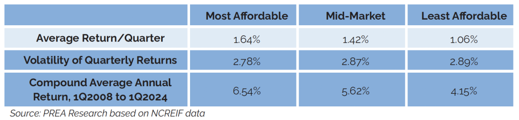 This stability is especially important for pension funds, which must match long-term liabilities with dependable cash flows. Affordable housing’s performance is further strengthened by its low correlation to macroeconomic cycles. Studies from NBER, Nuveen, NCREIF, and others show that affordable housing consistently exhibits lower vacancy rates and less sensitivity to economic downturns than market-rate multifamily housing. A 2024 PREA study found that over a 16-year period, the average annual return of the most affordable properties serving households at or below 80% of area median income outperformed higher income properties by 239 basis points, largely due to lower tenant turnover. In an environment where public markets can swing sharply, this kind of predictability becomes a powerful safeguard for pension portfolios.